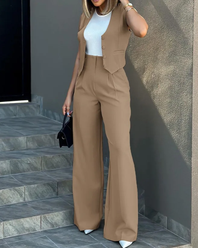 Conjunto de calças de trabalho elegantes femininas, roupas de duas peças, temperamento, viagem, colete abotoado, top e calças de perna larga, conjunto para uso feminino